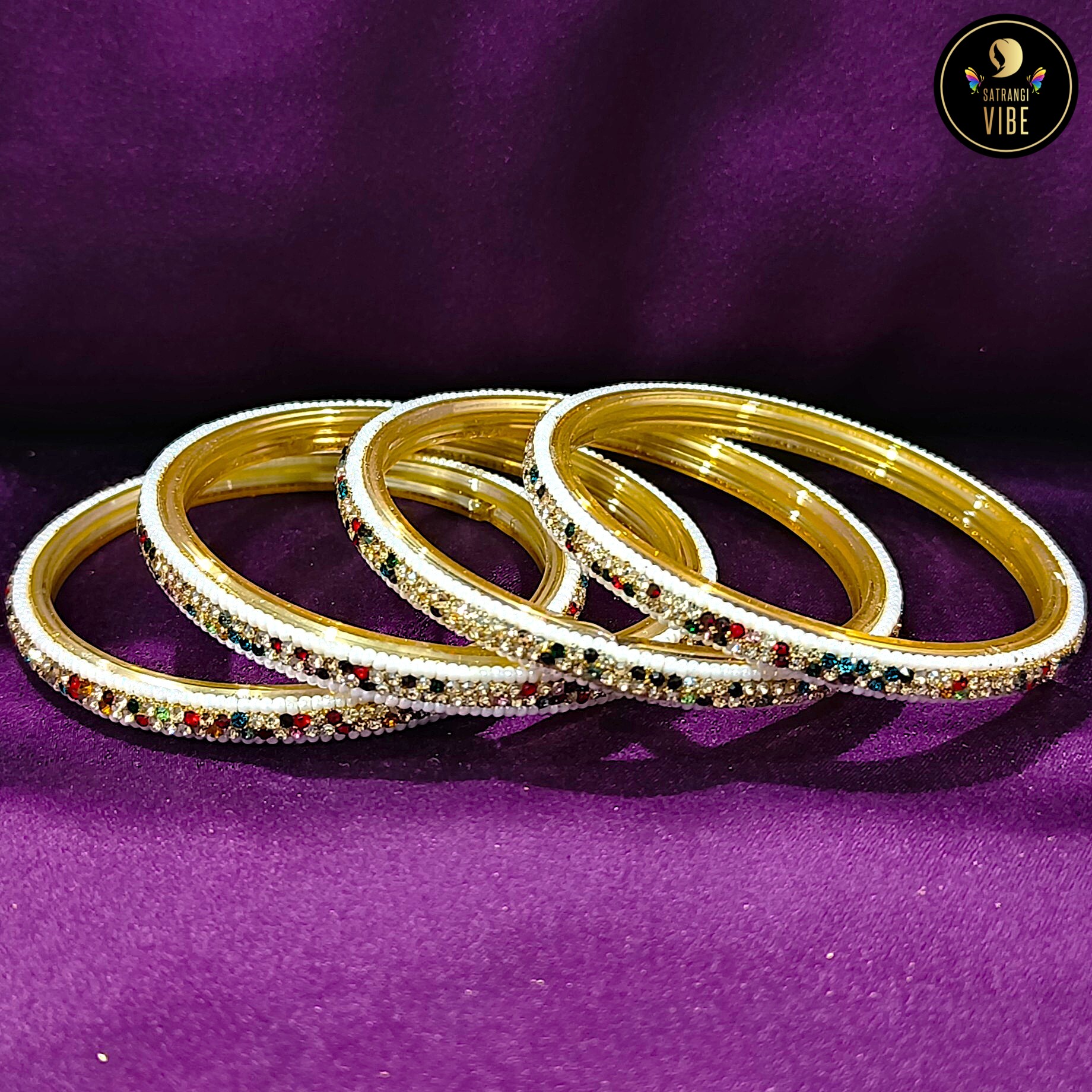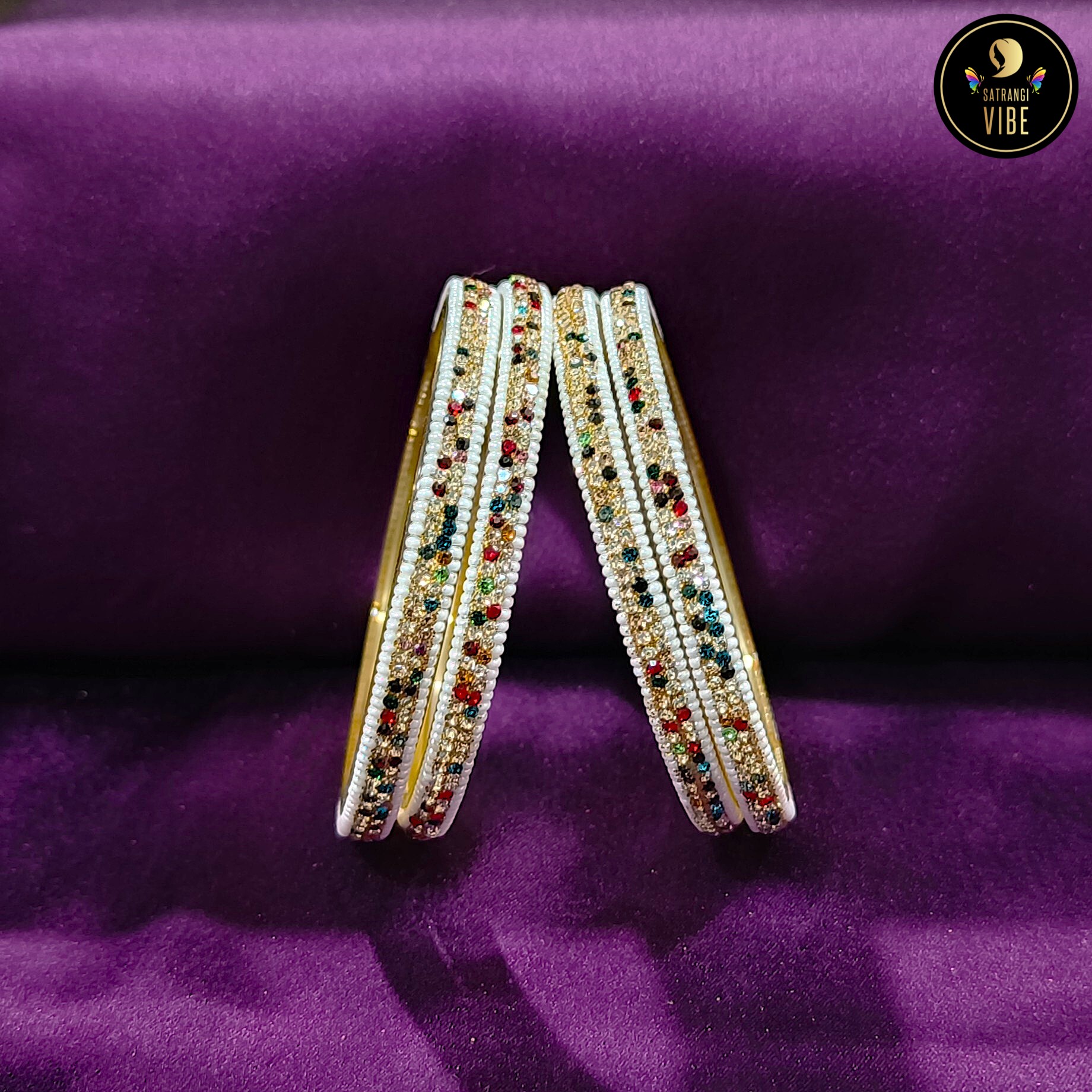 Add vibrant sparkle to your ensemble with this set of 4 coloured zircon stone bangles. Each piece radiates with rich hues and shimmering clarity ? perfect for festive flair or everyday elegance.