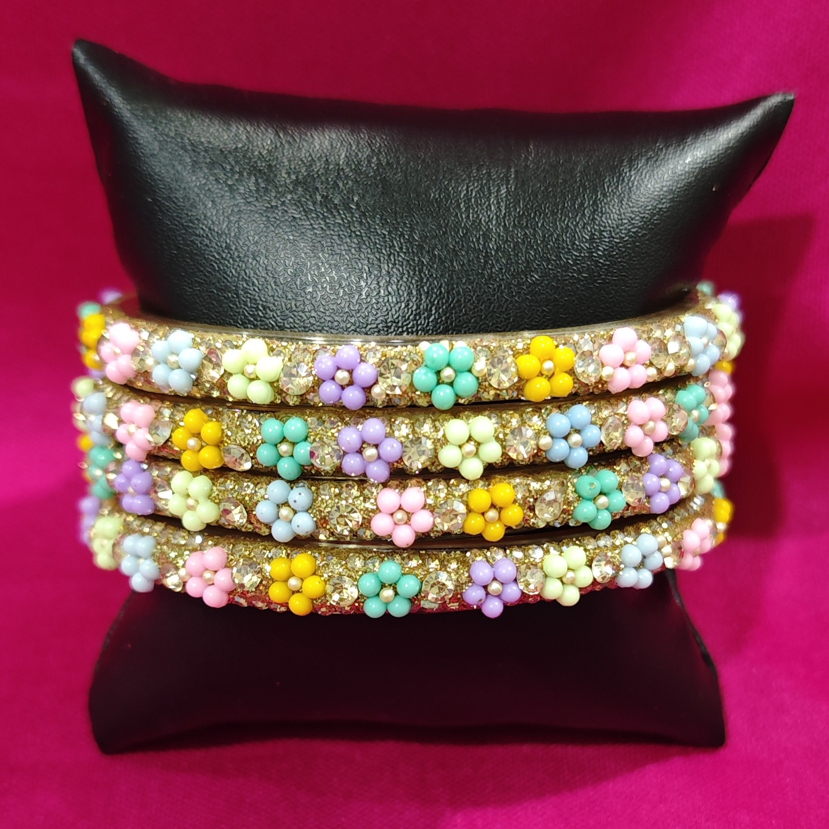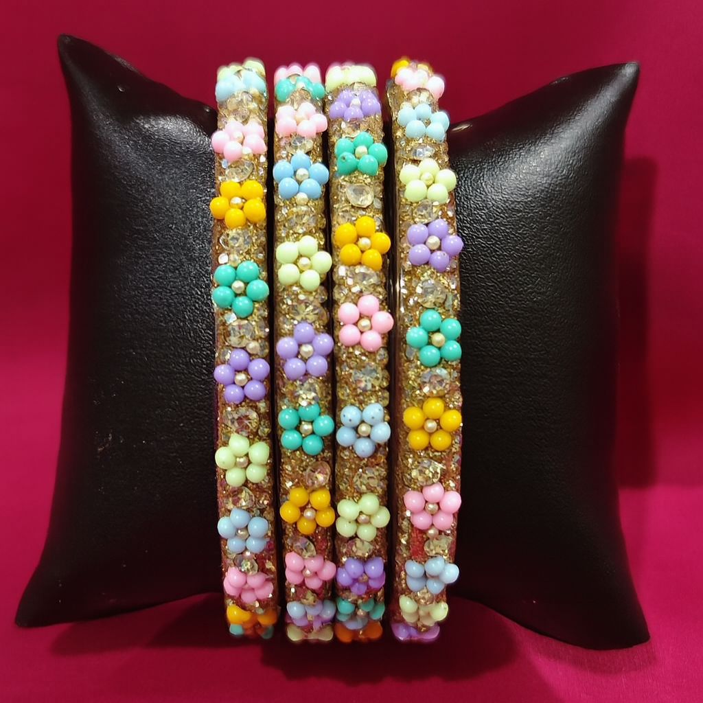 Add a splash of festive charm with this set of four handcrafted bangles, featuring pastel-colored floral beads and shimmering gold-toned accents. Perfect for traditional wear or vibrant fusion looks, each bangle blends elegance with playful detail.