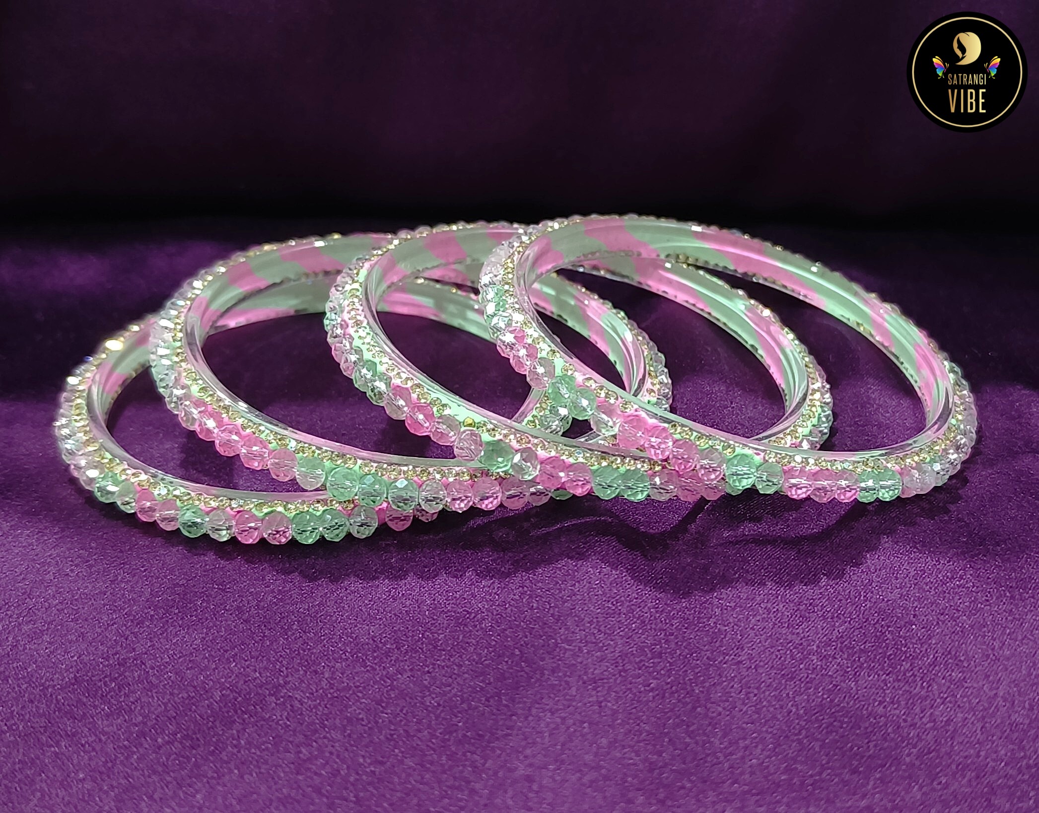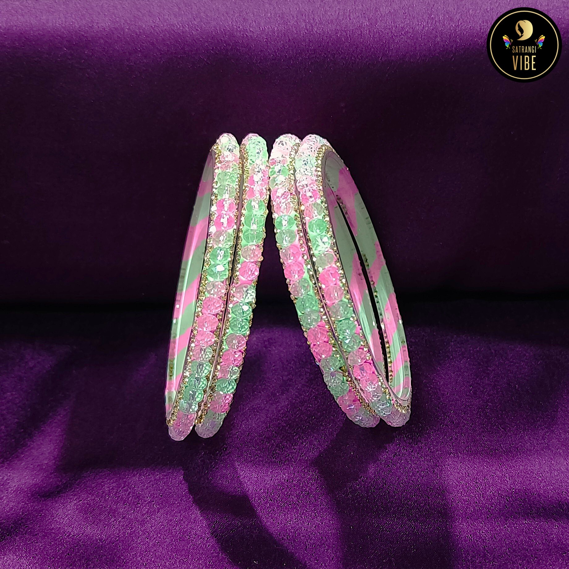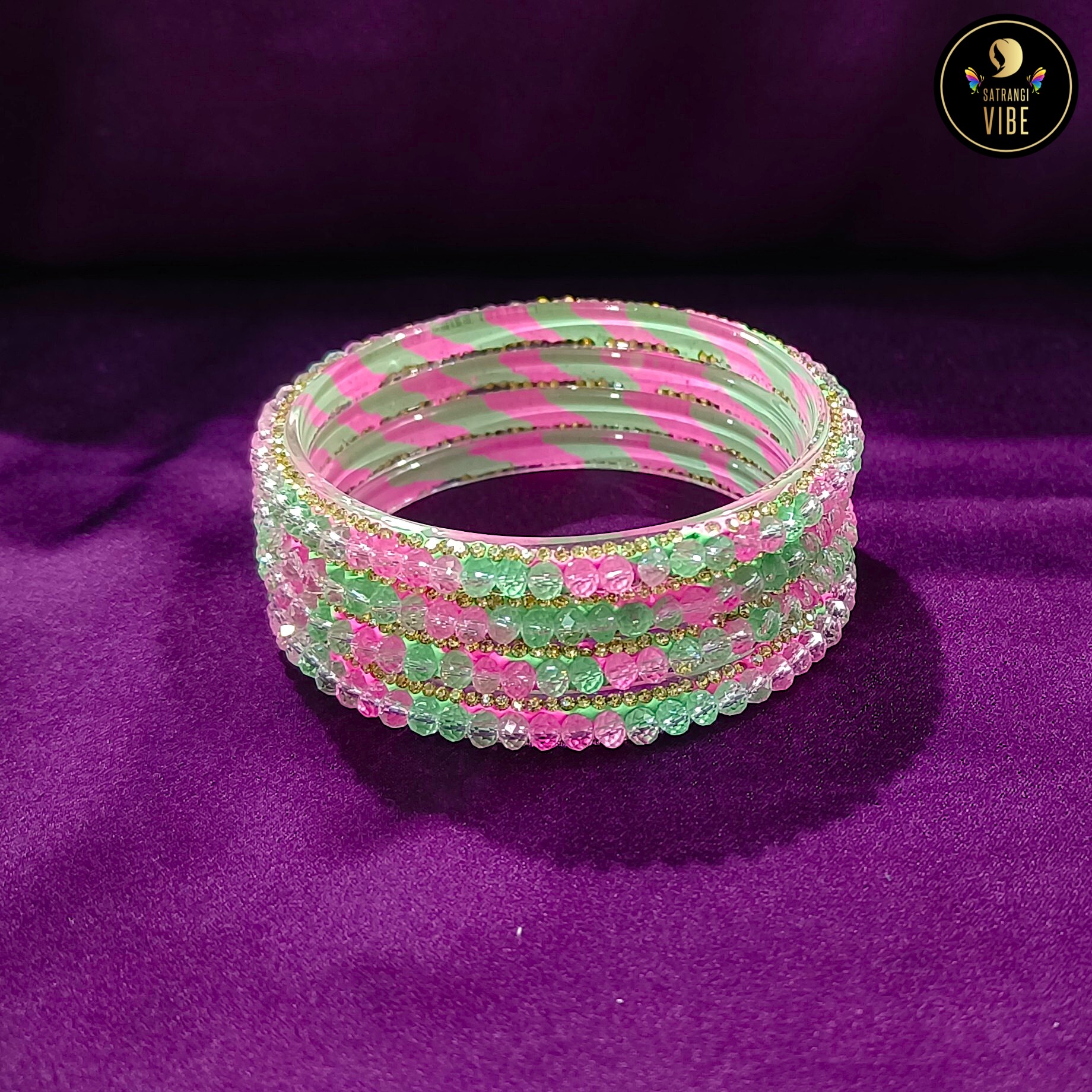 (Shipping Included)A set of 4 beautiful pink and green designer glass bangles