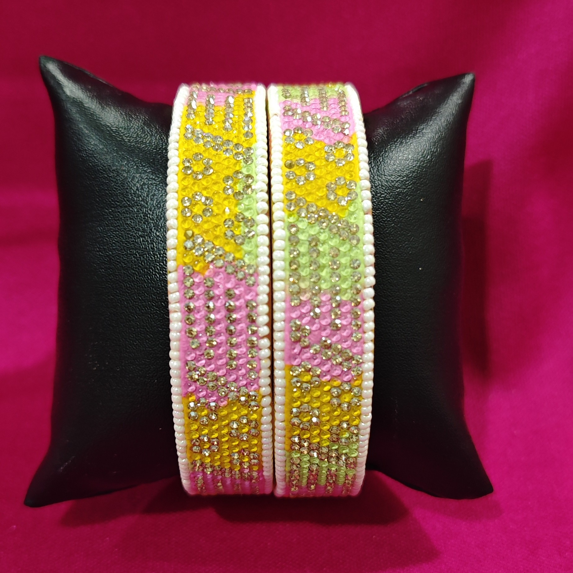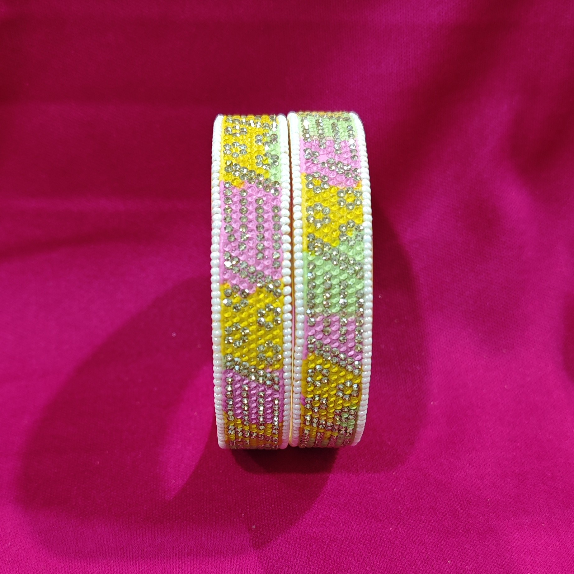 Vibrant and graceful, this set of two golden designer glass bangles features soft pink and yellow tints that blend tradition with a fresh, festive charm — perfect for elevating ethnic ensembles with a touch of color and elegance.