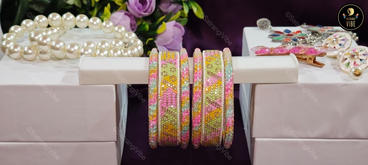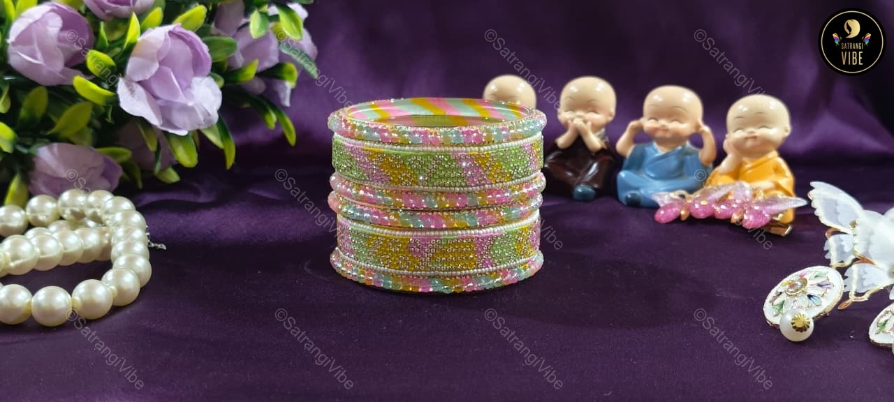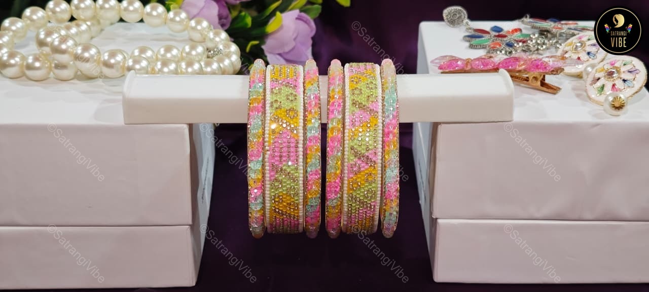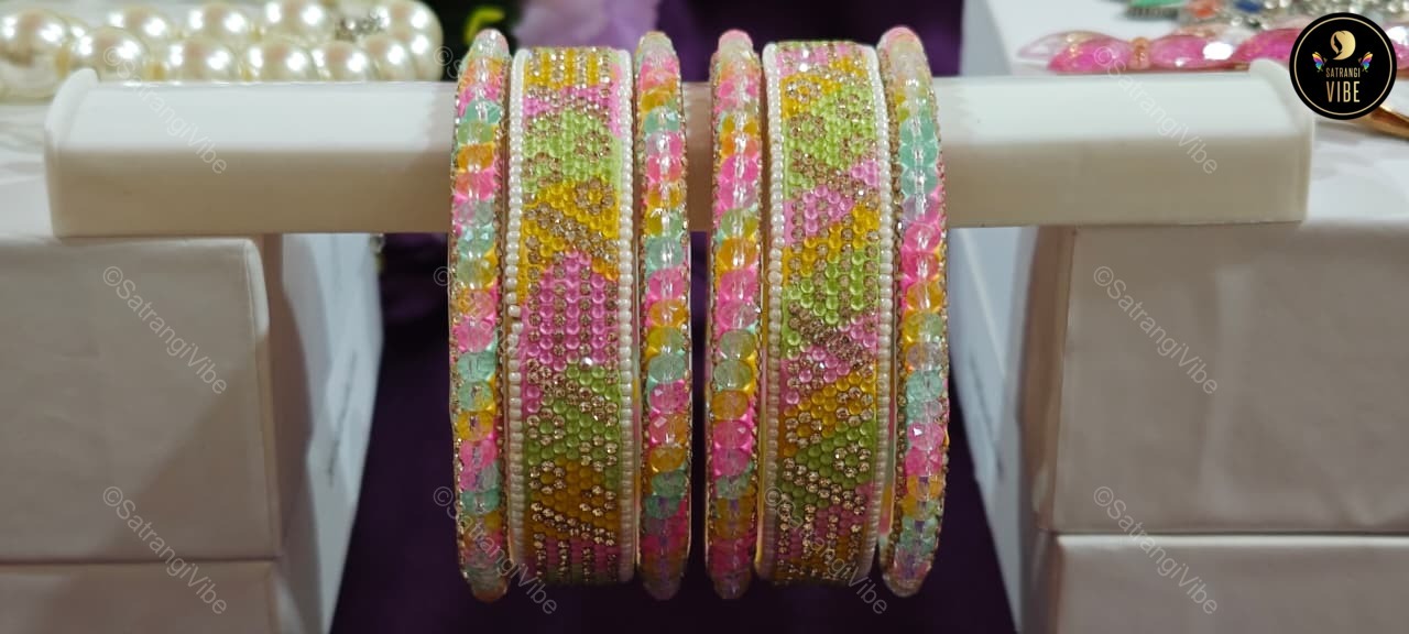 Brighten your look with this joyful set of six bangles in a lively trio of green, pink, and yellow. Each bangle adds a playful splash of color, perfect for layering or wearing solo to match your mood. Lightweight and easy to style, these bangles bring a festive flair to everyday wear and special occasions alike.