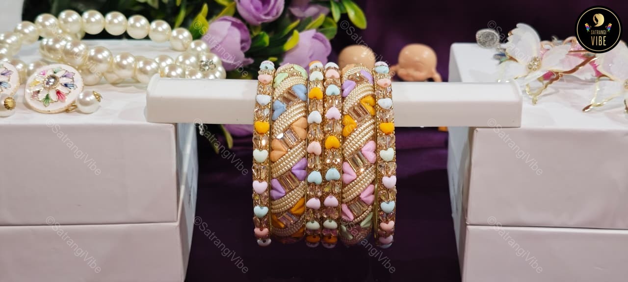 Delicate, colorful, and full of heart—this set of six bangles is a celebration of joyful femininity. Each bangle features soft, multi-colored tones and subtle heart motifs that add a playful yet graceful touch. Lightweight and easy to style, they’re perfect for adding a hint of romance to your everyday look or layering up for festive flair.
