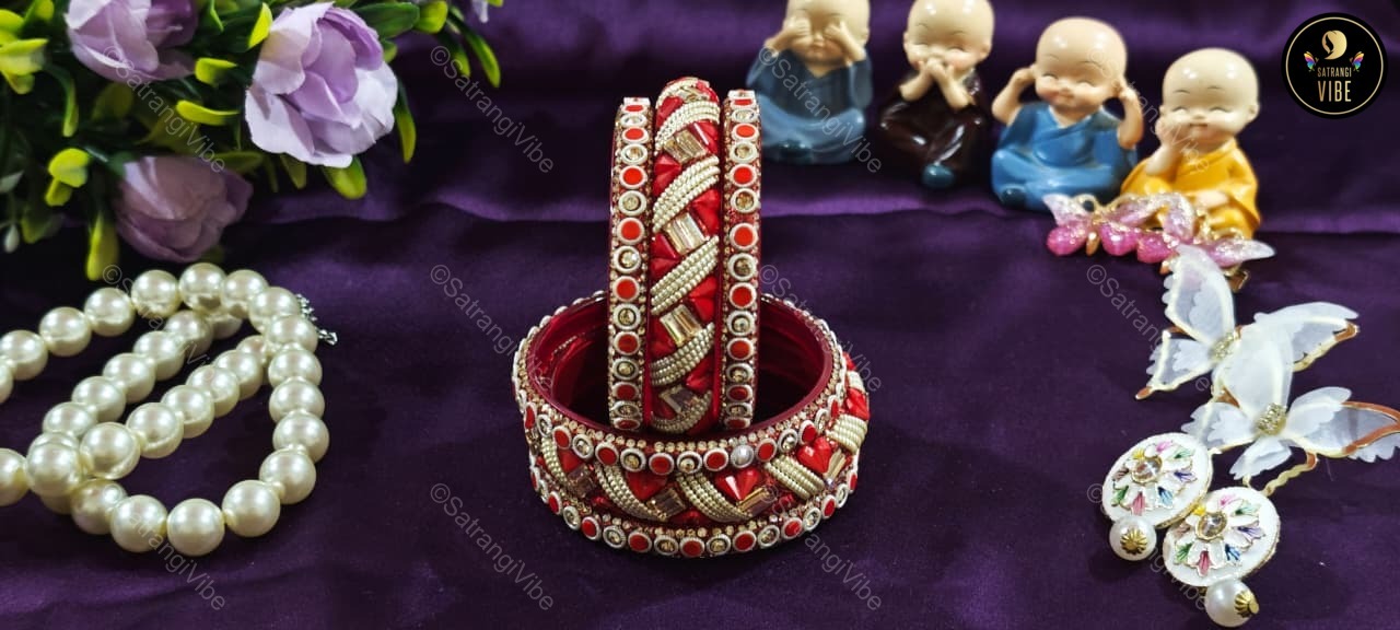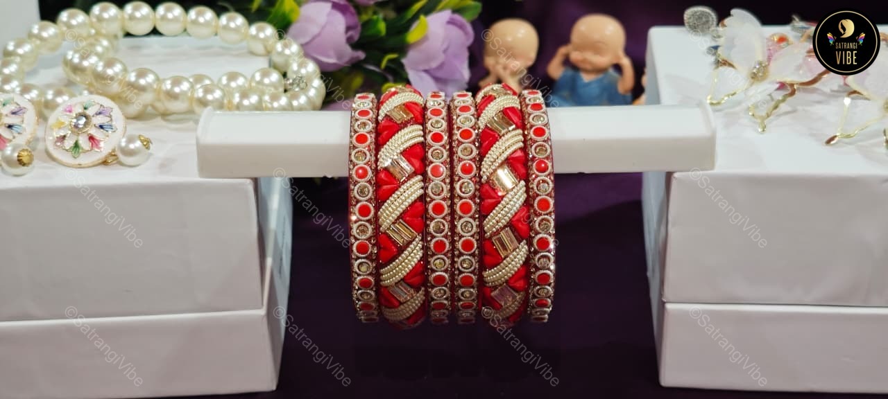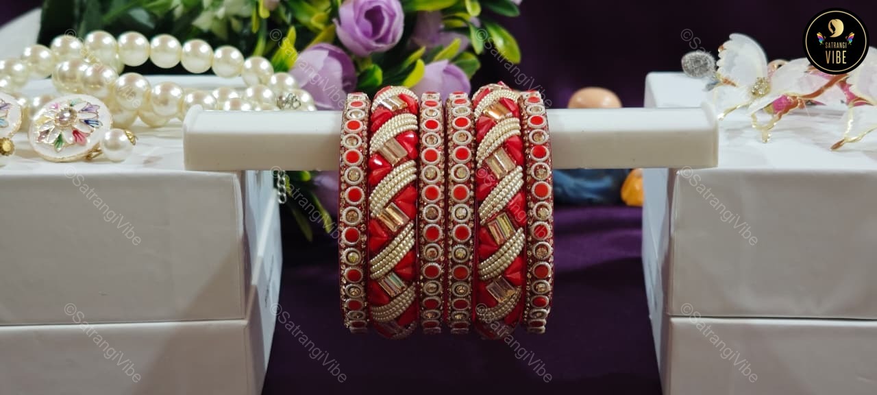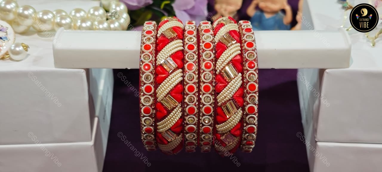 Celebrate love in every gesture with this vibrant set of six red bangles, each adorned with delicate heart motifs arranged in a graceful circle. The bold red hue symbolizes passion and festivity, while the heart design adds a touch of romance and whimsy. Whether worn for a special date, festive occasion, or simply to brighten your everyday look, these bangles bring warmth and personality to any outfit.