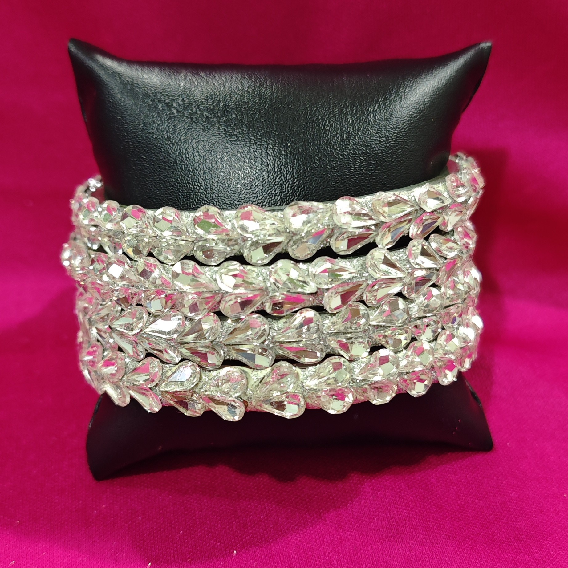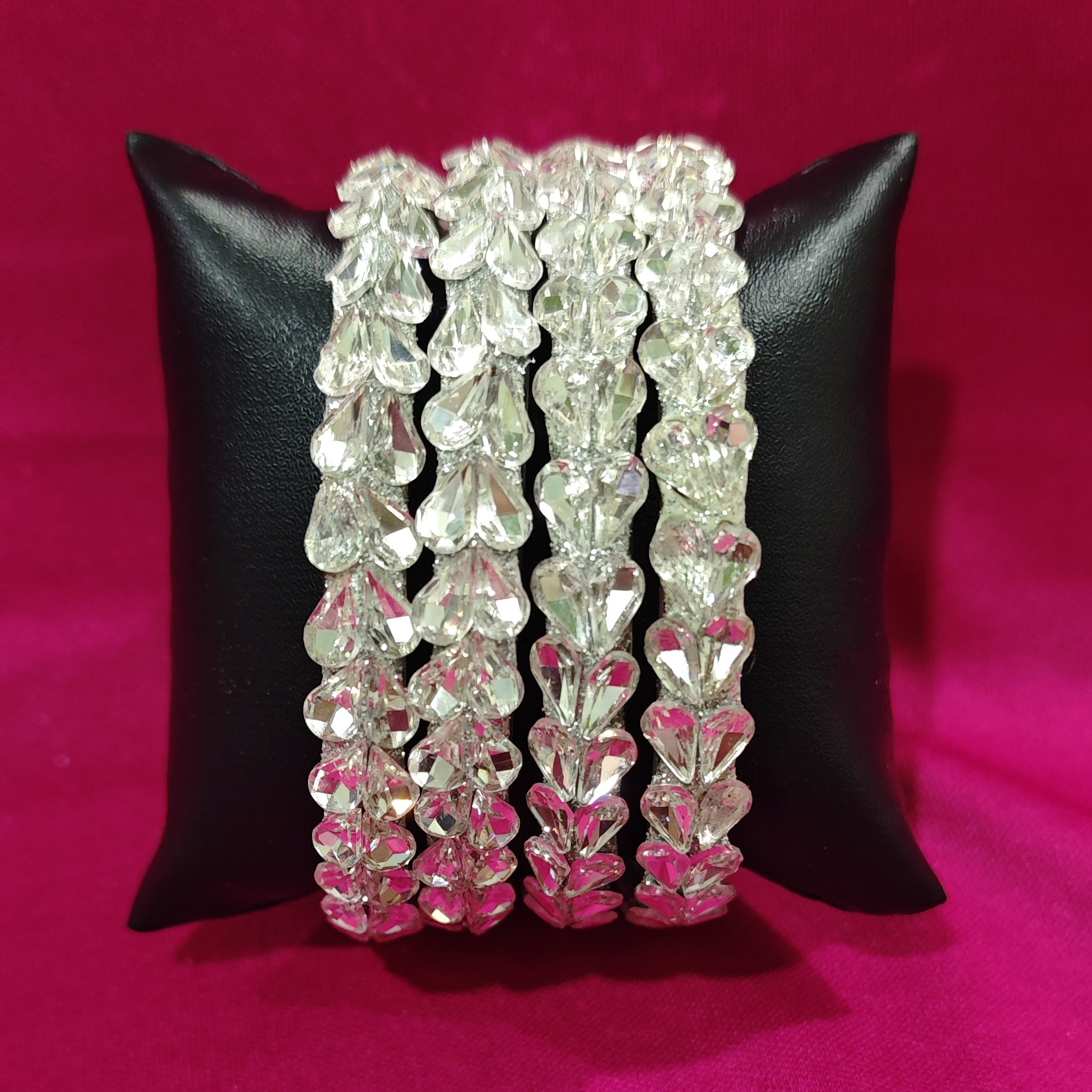 Romantic and radiant, this set of four silver crystal heart bangles sparkles with delicate charm — featuring shimmering heart motifs that add a graceful touch to festive and evening wear.
